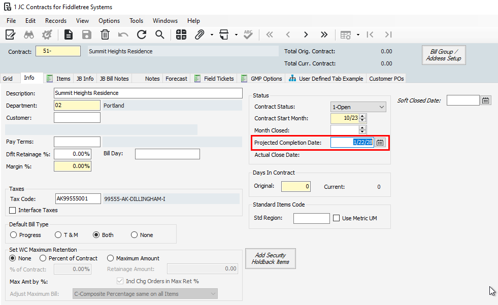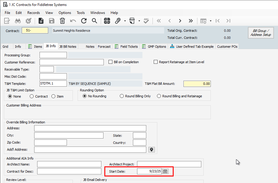 The Job Start and End Dates will pull from JC Contract fields StartDate and ProjCloseDate. Here are some screenshots to show these locations in Vista: