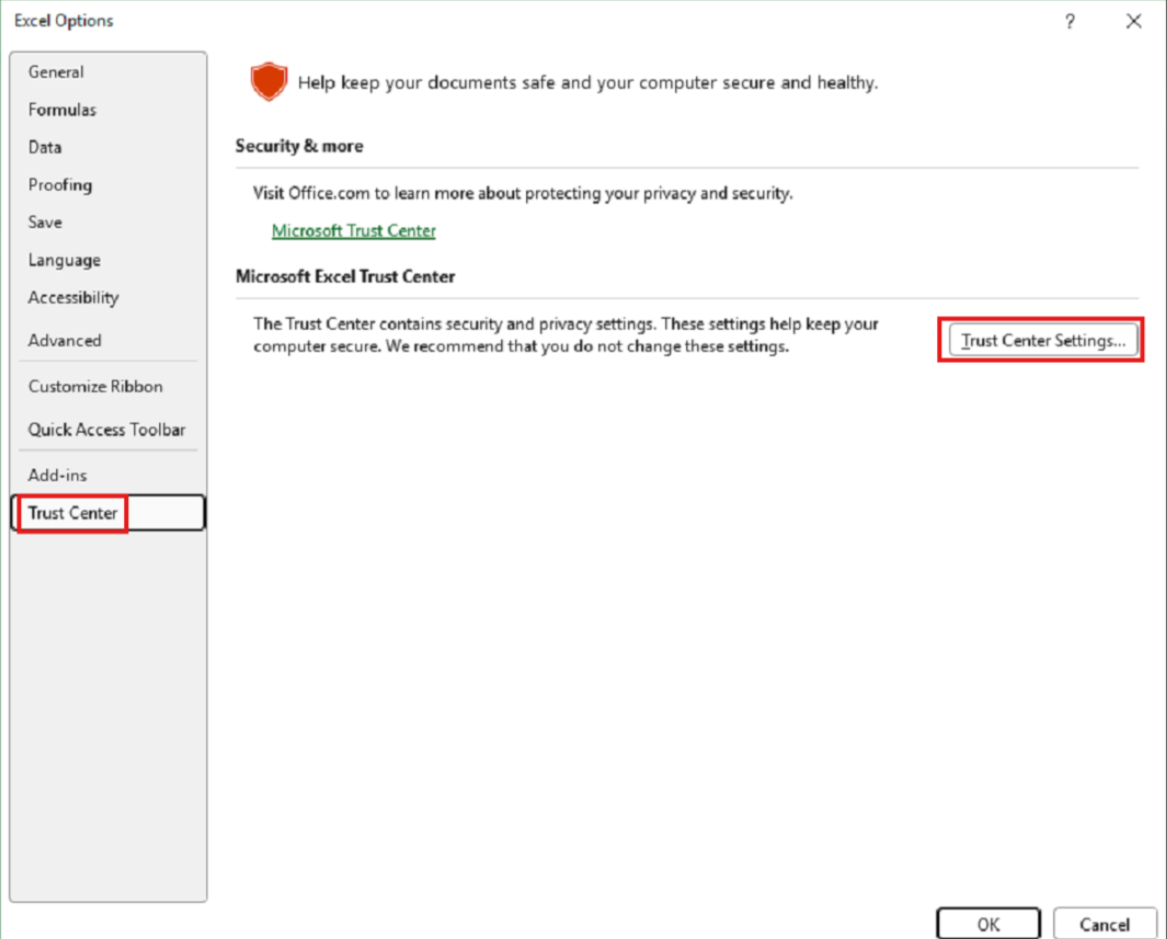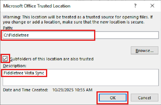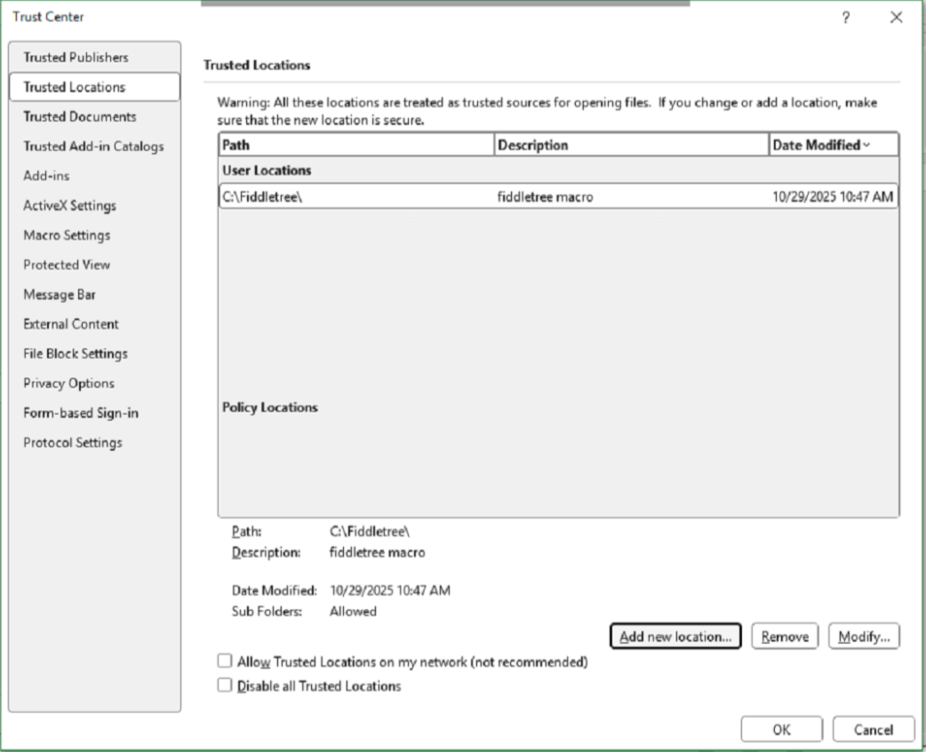 Then go to Trusted Locations > and "Add new location..." to the Resource Planning Import folder that contain the files for the Vista integration: